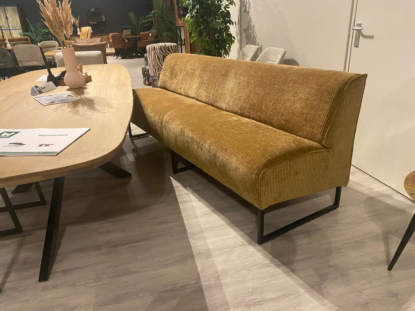 Eetbank Olga als rechte bank verkrijgbaar in de volgende afmetingen: 90cm, 110cm, 130cm, 150cm, 170cm, 190cm, 210cm, 230cm en een hoekelement 75x75cm.
