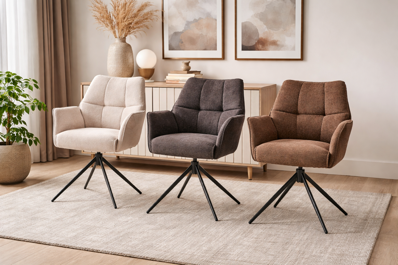 De stoel is uitgevoerd in een mooie stof en je kan kiezen uit de volgende 6 kleuren, Lichtbruin, Ecru, Beige, Taupe, Mosgroen & Grijs.