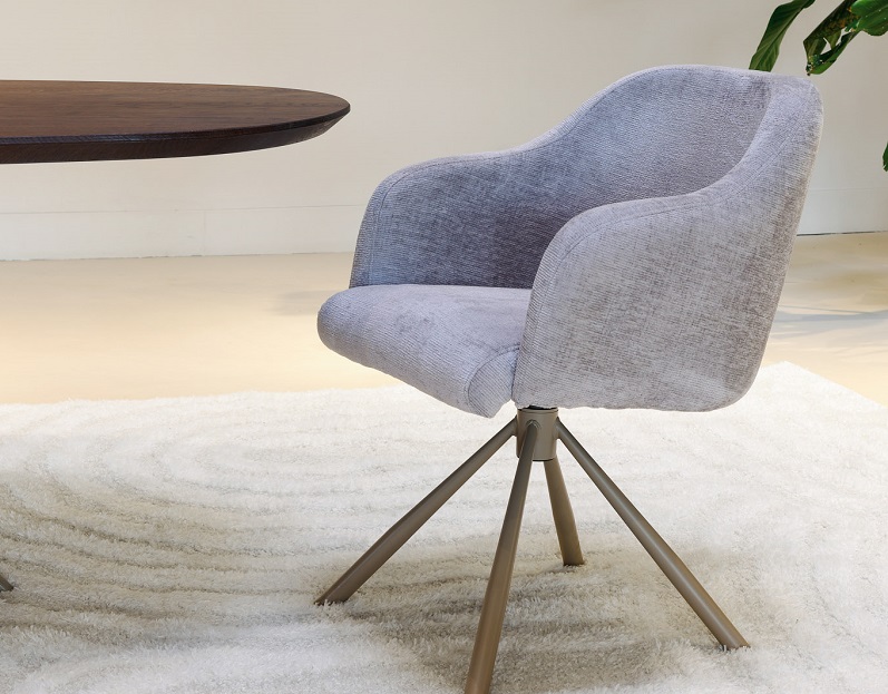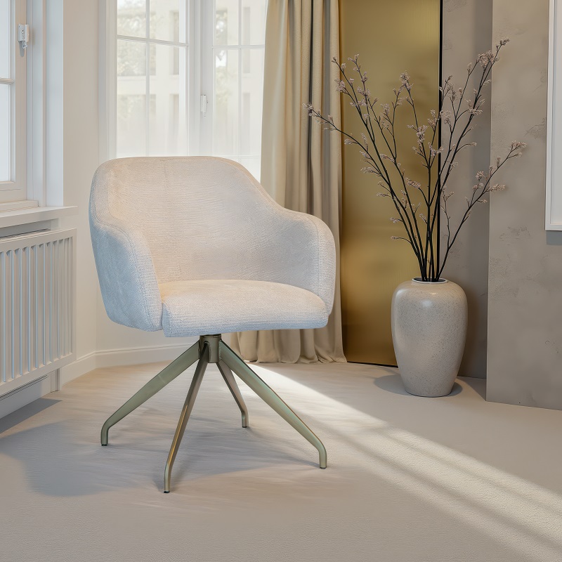 Ook deze comfortabele eetkamer fauteuil kan je helemaal naar wens samenstellen, 8 verschillende metalen onderstellen, Draaibaar, Vast of met zwenkwielen,  8 metaalkleuren & voor de bekleding keuze uit een zeer ruime collectie meubelstoffen met ruim 200+ verschillende kleuren.
