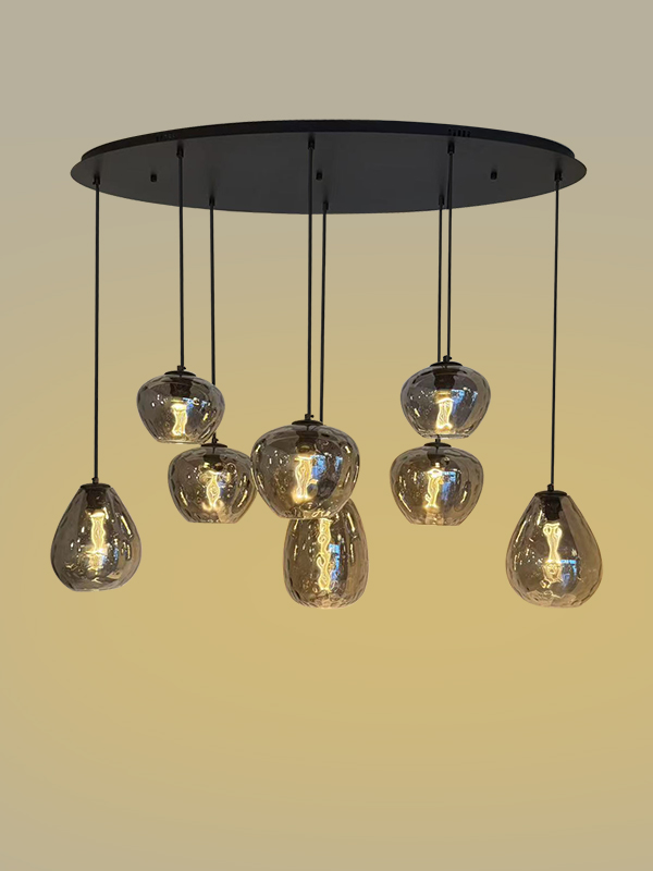 Met de hanglamp Hola-8 met maar liefst 8 prachtige glazen lichtpunten in de kleur Smoke of Amber haal je zeker een blikvanger in huis. De mooie zwart metalen plafondplaat is ovaal met een afmeting van 120-40cm. Totale hoogte van de lamp is ca. 150cm en al de lampen zijn op hoogte instelbaar.